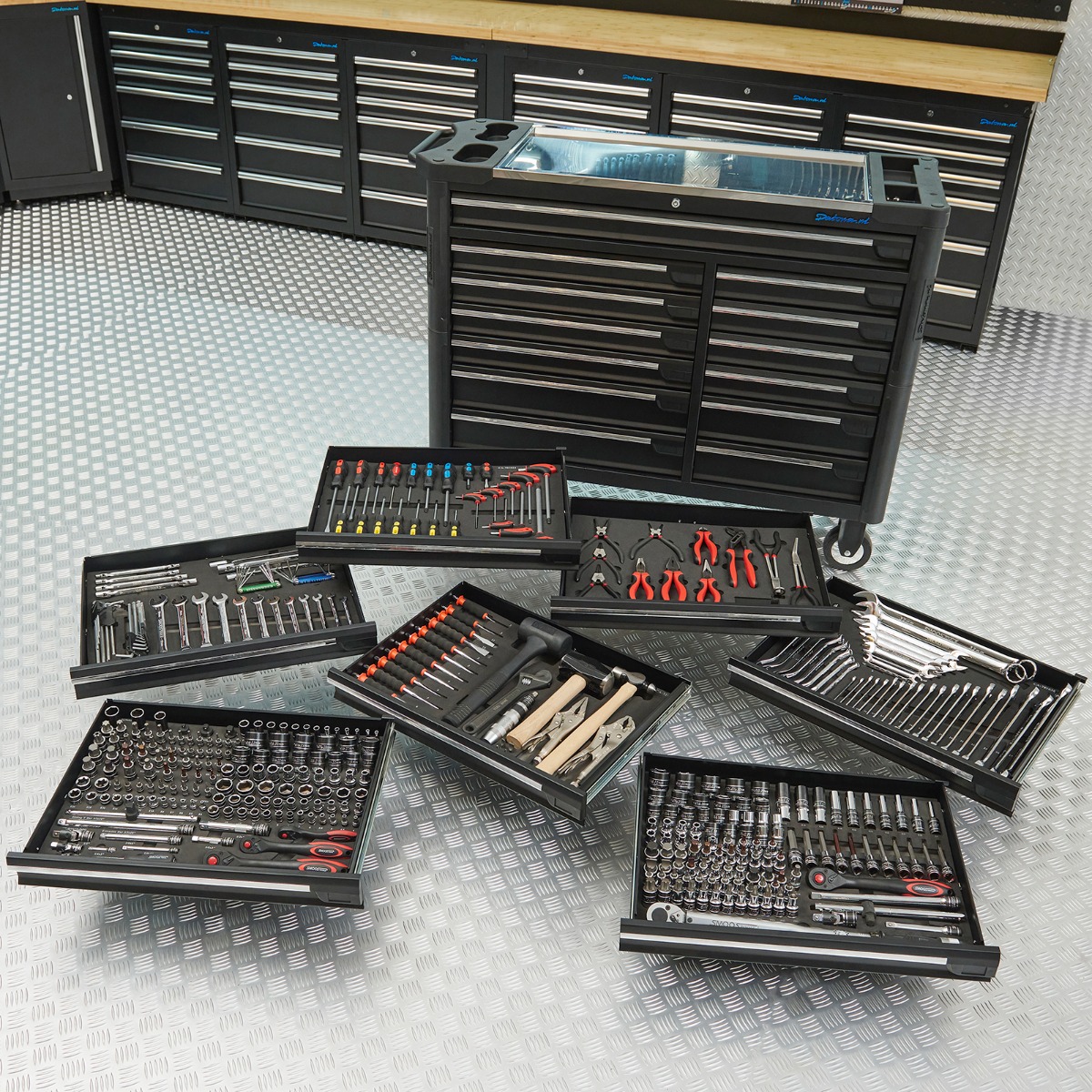 Mit 13 Schubladen haben Sie zusätzlich ausreichend Platz für Ihre eigenen Werkzeuge, Zubehörteile oder Spezialausrüstung. So bringen Sie Struktur, Effizienz und Qualität in Ihre Werkstatt – und das zu einem besonders attraktiven Preis.